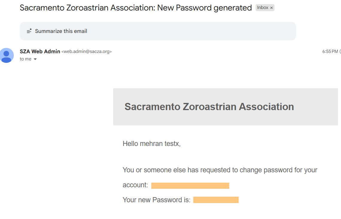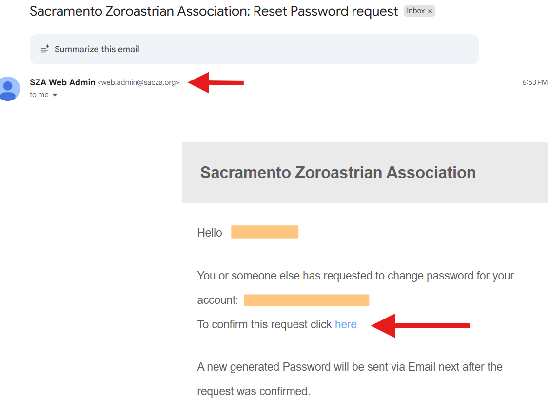 click on the confirmation link so we know your email is correct and someone else is not trying to get in your account. Once you do that, you’ll receive an auto generated password via a similar email as shown below